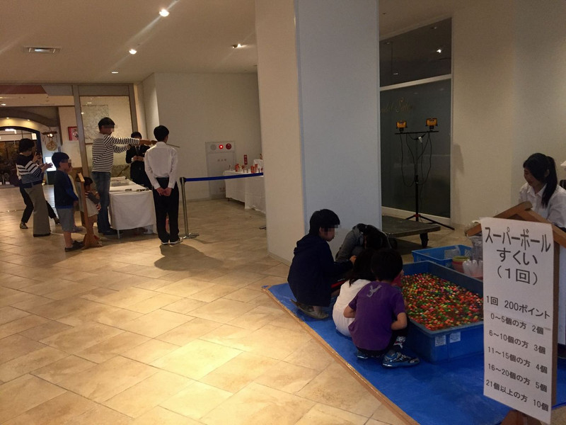 ついにGWのトップシーズンがやってきました!ご旅行中のお客様も多いと思いますが、いつも南淡路ロイヤルホテルのブログをご覧いただきましてありがとうございます。本日3日と明日4日はGW限定のイベントが多数開催されます。その一つがロイヤル縁日です。18:30~21:00まで、1階ロビーで開催しておりますが、18:30過ぎにロビーに行くと既に多数のお客様で賑わっていました。ディナーバイキングを召し上がってから、ロイヤル縁日にお越しになられたお客様も多いようでした。写真手前ではスーパーボールすくいを、写真奥では射的をお楽しみいただいています。特に射的はお子様以上に大人のお客様にもご利用いただいております。その他、ダーツやパターゴルフなど大当たやりや当たりに応じて、お楽しみ景品をご用意♪ロイヤル縁日に参加するには、受付で「たまくんポイント」をご購入いただいております。たまくんは南淡路ロイヤルホテルのオリジナルキャラクターです。たまくんファミリーの看板もロビーにありますので、ぜひご来館の際にはチェックしてみてくださいね♪たまくんポイントは100ポイント100円でご購入いただけまして、ロイヤル縁日はどのゲームで遊んでも1回200ポイントでご利用いただけます。ロイヤル縁日終了後に始まるビンゴゲーム大会は、ビンゴカード1枚を500ポイントでお楽しみいただけます。その他、バルーンアート風船教室や海ホタルショーも開催致します。ぜひ南淡路ロイヤルホテルで、楽しいGWをお過ごしくださいませ♪ブログ担当キキでした♪