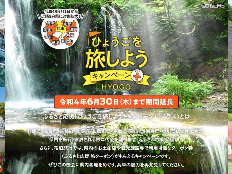 兵庫県民割【ひょうごを旅しようキャンペーン】の割引対象期間が「2022年6月30日(木)宿泊分」まで延長されました!また、割引対象エリアが兵庫県に追加して、滋賀県・京都府・大阪府・和歌山県・鳥取県・岡山県・徳島県・香川県の8府県在住者も対象となります!◆ 対象期間(延長後) ◆2022年6月1日(水)~2022年6月30日(木)宿泊分まで(2022年7月1日(金)チェックアウト分まで)◆ 対象在住エリア(変更後) ◆兵庫県・滋賀県・京都府・大阪府・和歌山県・鳥取県・岡山県・徳島県・香川県◆【6月1日(水)以降】◆※ワクチン3回接種済またはPCR検査、抗原定量検査(出発日3日以内)、抗原定性検査(出発日1日以内)が陰性であることが必要です。※チェックインされる際に、お客様のワクチン接種(3回分)証明書又は各種検査の証明書の提示が必要になります。(撮影画像・コピーでも◆ ひょうごを旅しようキャンペーン申請方法 ◆①電話にてご宿泊を予約の場合・ホテルにてキャンペーンの宿泊割引クーポンを代理申請させていただきます。ご住所や同行者様のお名前をお伺い致します。②ホテルホームページにてご宿泊を予約の場合・宿泊予約後、キャンペーンページより宿泊割引クーポンの申請・発行し、当日チェックイン時にご提示ください。・宿泊プランのお支払い方法は、現地支払いをお選びください。※事前決済をされると割引されません。※キャンペーンページへは、ホテルTOPページ「ひょうごを旅しようキャンペーン」バナーよりアクセス、または下記よりアクセスください。<ステイナビ ひょうごを旅しようキャンペーンページはこちら>③ネット専門旅行会社様(じゃらんnet・楽天トラベルなど)からのご予約の場合・ご予約時に各サイト様発行の対象クーポンを取得していただき、ご利用ください。※ネット専門旅行会社様経由のご予約は6月8日(水)より予約受付開始となります。※ご宿泊当日に住所がわかる身分証明書をお持ちください。※感染状況などにより変更になる場合がございます。※※「ひょうごを旅しようキャンペーン」詳細につきましては下記よりご確認ください。<ステイナビ ひょうごを旅しようキャンペーンページはこちら>その他、お問合せはホテルまでお寄せください。 TEL:0799-52-3811(9:00~18:00)