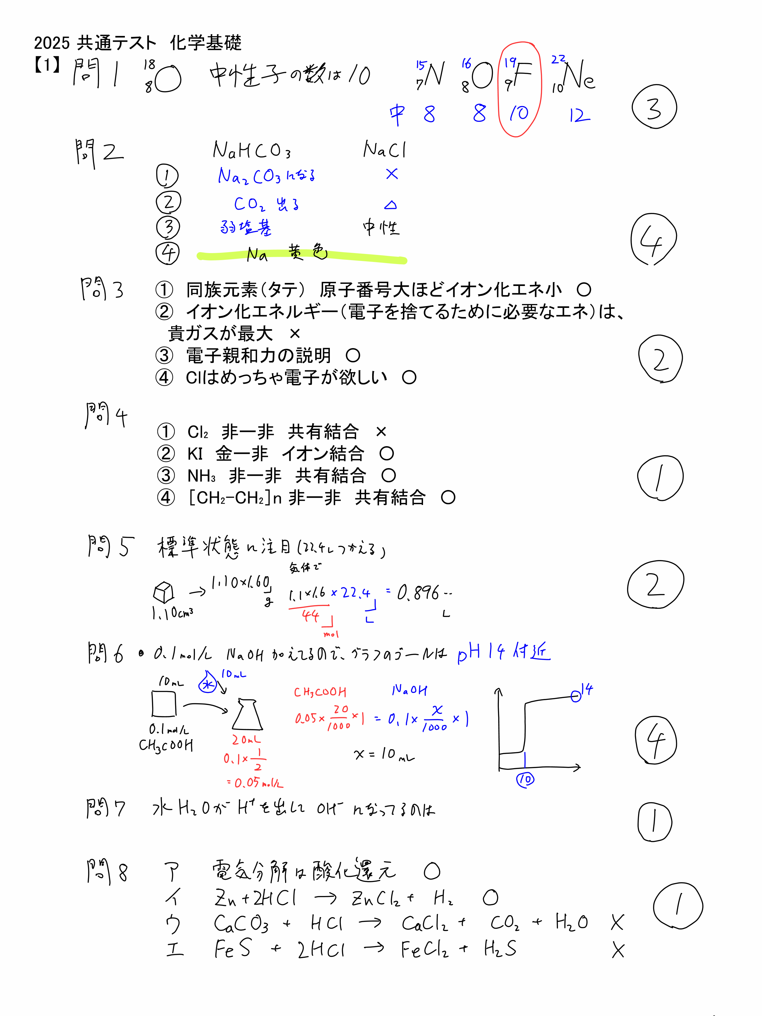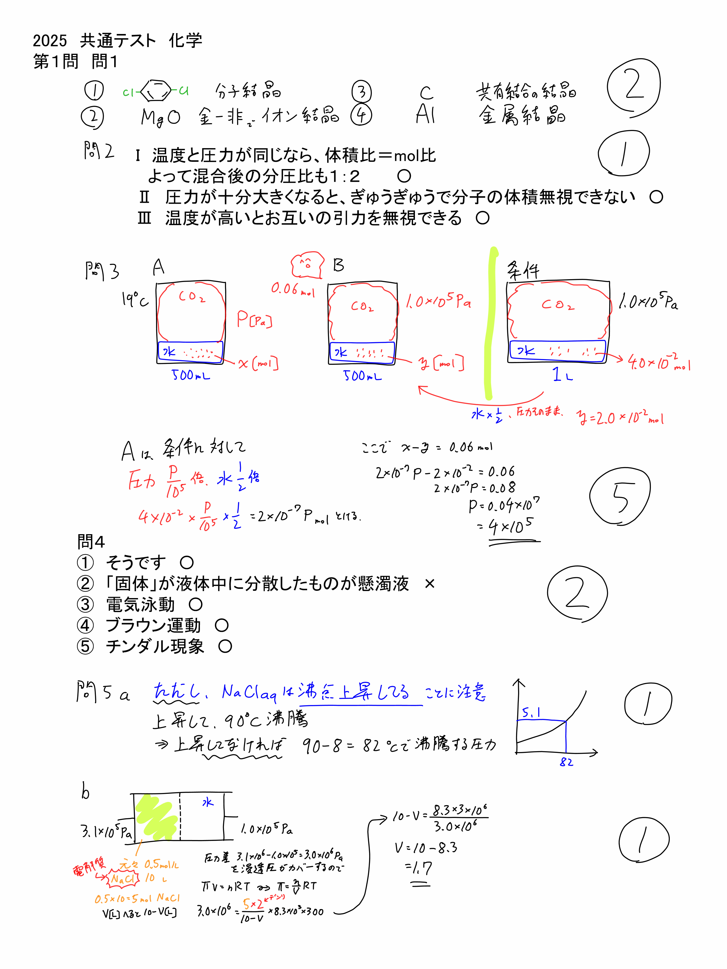 皆さんのご協力もあり,今年も某予備校よりも早く「解説」を公開できております。なにせ急ぎのもので字が乱雑だったりわかりにくい個所もあるかとは思いますが…ご意見いただければ補足訂正もしますので,よろしくお願いしますね。問題はこちらなどを参考にしてください。【1】1のハロゲン,すこし選びにくい。2の状態図は定番ではあるもののなかなかセンターでは経験不足か。3の文字式自体も定番だが,水素と窒素が同じ量,ってのをうまく処理できたかがキモ。4のトリチェリも定番だがセンターでは慌てそう。5の浸透圧も,慌てて「圧力差」を忘れてしまうとやられる。6はコロイドの知識。比較的やさしい。【2】1a 聞き方がちょっとひねっているが,中身は優しい。 bも,生成熱の定義さえ注意すれば大丈夫。2 エネルギー図でやると面倒なので,ヘスでさっと済ませたい。3 グラフが読めないときついが,読めれば即終了の問題。4 Iはルシャトリエだが,速度も考慮してグラフが読めるか。Ⅱも同様。5 聞き方が意地悪。二次の問題等で式変形などに慣れていれば早いけど…※1/26追記 Kのところを見間違えて10^-5で計算していましたが,⁻6ですね…pdfで見るとつぶれてしまって騙されていました(´;ω;`)訂正しました。【3】1 金属の性質は簡単2 酸化物の性質もそんなに難しくない。3 aは基本。bも,慌てず丁寧にやれば基本通り。4 これもカルシウムの基本事項。5 突然難しめの問題。ビビらずにファラデーに持って行けるかどうか。※2021/2/13 追記酸化物,過酸化水素の自己酸化還元でしたが,二酸化マンガンに余計な解説があったので訂正しました。ありがとうございます。【4】1 基本の選択は簡単2 ちょっとnの使い方が独特。分子量もおいてしまったほうがスムーズかと。3 芳香族の基本事項4 構造式をかいてみればよい。5 実験やったことない人が多いかも。ちゃんとイメージできているか。分液漏斗も。同位体でビックリしそうだが,聞いていることは難しくない,二次対策でそんな問題に触れていれば慌てず正解できそうだが…【5】1 合成高分子は定番,しかしゴムはマークが薄いかも…2 等電点,双性イオンなどについては押さえておきたいが,リシンの電離はちょっと難しい。【6】1 暗記というかんじ,知らないときつい。2 あわてず,3.5:1をうまく使えたか。文字を減らす流れで。【7】1 やっぱり暗記。なかなかねえ。2 あえてのマルトースでひと手間難しい。できれば【6】のほうが素早く解けたのかもしれない。というわけで,全体を通してやや難化か。計算の手間とかよりは,少し聞き方に癖がある問題が多かったようにも思うぞ。