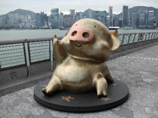 金の豚のモニュメントは、「麦兜(マクダル)」という
