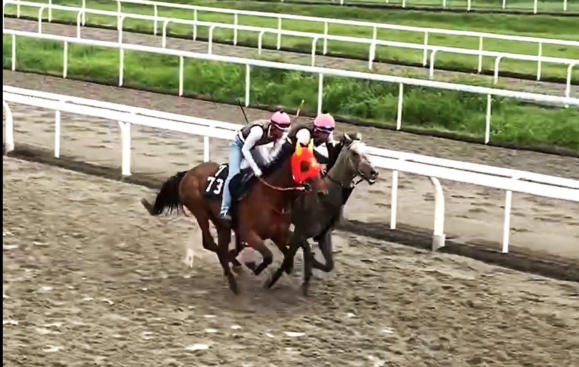 本日調教を行ったクリップクロップ号(外)とフルミネビアンコ号(内)@川崎・小向トラック川崎・田邊厩舎所属の2頭が併せ馬で追い切られ、その様子を動画にて撮影頂きました:〇 現在ミノルロドリゴによる地方馬主プロジェクトにおいて、川崎・田邊厩舎に預託中の2頭。1頭目はフルミネビアンコ号(牡2歳、父フリオーソ)は言うまでもなくダブルミリオンの2番仔。そしてもう1頭はクリップクロップ号(牝3歳、父サトノダイヤモンド)。先日のサラブレッドオークションで先輩と共同で落札した馬である。順調に行けばクリップは10月、フルミネは11月のデビューを予定している。〇 今朝はその2頭の追い切りが行われ、田邊調教師さんから調教動画を頂きました: クリップクロップ号とフルミネビアンコ号の併せ馬調教〇 1周1200mのダートコースを2周。特に2周目は馬なりではあるがビッシリ併せ馬を行われ中々迫力のある調教動画になっている。調教タイムは4F(800m)58秒4、3F(600m)42秒4と、田邊師さんからも、中々良い感じで(追い切りが)出来ましたというコメントを頂戴しました。〇 動画では内がフルミネビアンコ号、外がクリップクロップ号であるが、共に馬なりでビッシリ最後まで併せ馬を行っている。実際はJRAの経験があるクリップさんの方が余裕綽々で、フルミネ君はまだ余裕がそれほどないのでしょうが、負けじとしっかりと食いついている様子が伺われ、中々この牡2歳馬もまだまだ奥手の血統ながら、根性はあるな、と感心してしまいます。〇 まずは10月の川崎開催でクリップさんがデビューを果たすことになりますので、先輩女子として後輩にしっかりとした見本を見せてもらえればなと期待します。フルミネ君は10月の能力試験に向けて、体力を付けていってほしい。両馬が、これからも無事に調教が進められ川崎デビューに漕ぎ着けられます様、お祈りしています❣❣