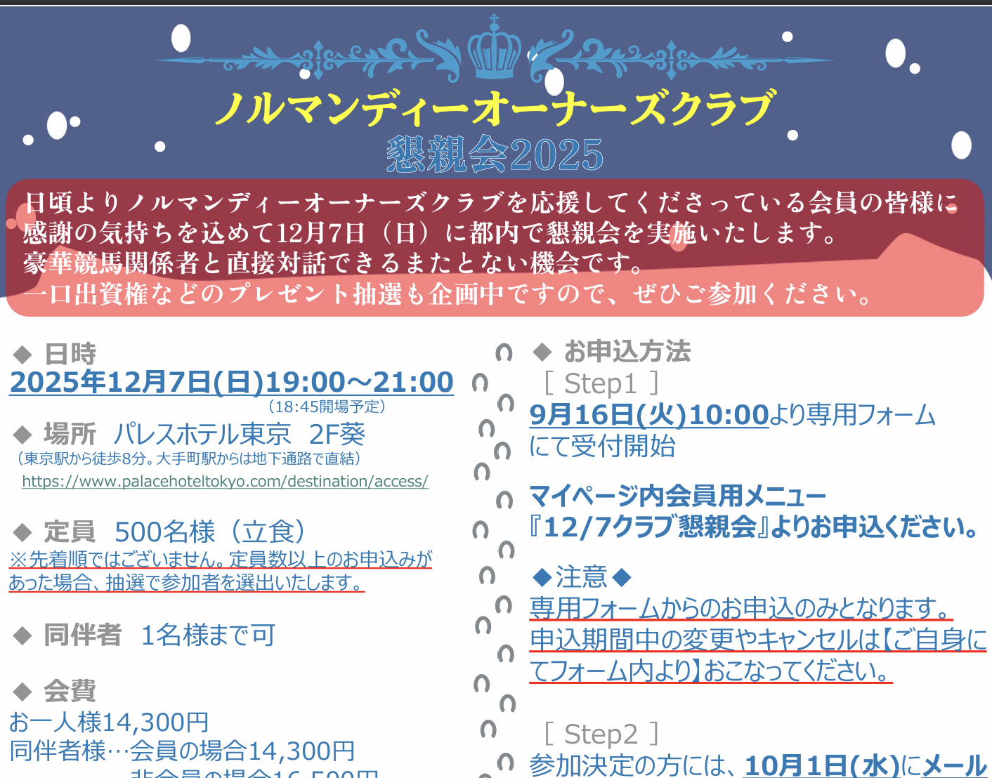 今年の懇親会は例年に比して規模、グレードも大幅アップ☆彡©ノルマンディーOC本日、公式ページにおいて年末恒例の懇親会の開催要領が発表された:〇 例年新宿ヒルトンで行われていた年末恒例の懇親会であるが、今年は場所を変えて東京駅近くのパレスホテルで開催されるとの発表があった。しかも定員が500名ということで、新宿の時は350名程度だったと思うので今年はかなり規模を拡大して実施される。またホテルのグレードとしても帝国ホテルと並ぶパレスホテルならワンランク上にアップしたと言えます。〇 以前の私のブログで、出来るだけ希望される会員さんが参加できるように会場の規模の拡大をお願いしてきましたが、見事そのリクエストに応えて頂いた内容となっています。おそらく会場の確保などかなり早い段階から動かないとこのような場所は取れませんから、昨年の反省から早めに動かれたのでしょう。これで、余程くじ運が悪くなければ参加は大丈夫でしょう。感謝したいと思います👍〇 先週のレースで6着と敗れた出資馬ノーブルロジャー号。レース内容について、吉岡師がどのようなコメントを出されるのか注目をしておりましたが、前走同様3角でキックバックに怯んで頭を上げ、前と離されてしまったが最後またゴール前で盛り返しているように、キックバックにさえ慣れてくればもっとやれていいと強気な姿勢、時間(慣れ)が解決してくれるという要素もあるのかと思います。〇 しばらく次走(10/26東京・神無月S)まで時間があるので今月は外厩先で一息を入れて10月になると厩舎に戻されるものと思います。久しぶりの東京コースでデビュー戦のようにのびのびと走ってくれたらなあ、と期待をしております。ノーブルロジャー号、府中で会いましょうね!!
