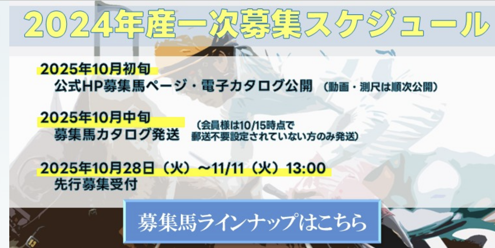 9/27募集馬見学会におけるNo.12 スノークラフトの24(LINE馬友さんご提供)今宵は月曜日に公開された24年産1次募集馬のカタログ情報を見てひとり語り:〇 総勢36頭のラインナップ。募集馬見学会も終了し、これから各馬に対する歩行動画や牧雄代表などによる紹介ビデオが公式ページにアップされていくものと思うが、今回のラインナップは一言で言えば、「高額種牡馬は捨てダート路線強化」、ノルマンディーのOC独自性を模索した内容と言えそうだ。〇 そして新たに創設された500口募集枠。前回はあえてこの500口を「厳選500口」と命名させてもらい公式ページがでも500口が色分けされていて特別なように見える工夫がされている。事務局側の本音を推察すれば、例年売れ残りが必至な3,000万円に近い、またはそれを超える募集金額の馬に対していかに魅力的に見せて売りさばくか苦慮された結果出てきた策なんでしょう、多分〇 この中に我が出資馬ノーブルロジャー号の弟、ノーブルレディの24が入っているが、見学会に行かれた馬友さんによれば、イマイチピンと来なかったという印象だったと。この金額ではさすがに先行販売段階で売り切れるとは思えず、年末の懇親会で色々情報収集して判断してもよいのかなと思っています。〇 500口馬(4頭)の中では、ハマナスの24(父ルヴァンスレーヴ)が良い馬に見えます。セレクションSでもかなりのバイヤーさんが声をかけて白熱したセリになっていました。さてこの2,850万円、1口57,000円という設定がどう評価されるかですが、兄弟が結構走っているので高額であっても1口くらい行くか?といった期待を集める可能性はある。すんなり複数口を買える状況なら、清水の舞台から飛び降りる覚悟で検討してみたい。〇 400口の中では、まずはNo.6 ウッドシップの24(父ゴールドシップ)、父は今年の宝塚記念馬を出したり今や絶頂期ともいえる種牡馬。母親もJRA実績(4勝)から申し分ない。北海道サマーセールで935万円で落札されたので1,500万円以下で出してくるかと思ったら強気の1,800万円の値付けで、うーんと言ったところだが、まだリーズナブルな価格帯だと言えますね苦笑。〇 No.12 スノークラフトの24は岡田スタッド生産馬。父はマジェスティックウォーリアで今回の募集馬に3頭いるうちの1頭。3頭ともいい馬だなあと思っていますが、この募集馬は母親の系統にスマートレイアーもおり活力充分。同じ種牡馬のセレクションS購入馬に比べて、さすが自前の生産馬故リーズナブルな価格帯が何とかキープされている。注目の1頭だ。〇 NO.14 チタノプリンセスの24は3頭いるダノンレジェンドの産駒の内の1頭。おそらく人気は全兄にサヨノネイチャがいるNo.8 オムズビの24の方かと思うが、馬体写真を見て直感的に良いなと思った馬だ。この産駒は初仔だが、母親の競走馬としての実績もあり、初仔でも期待充分といったところか。まだこれから情報が色々出てくると思いますのでじっくり考えていきましょう☆彡