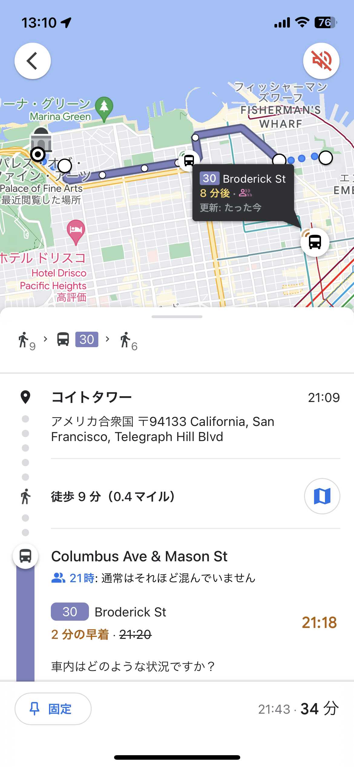 後にも先にも動いてるバスの位置を見れるGoogleマップはサンフランシスコだけでした。
