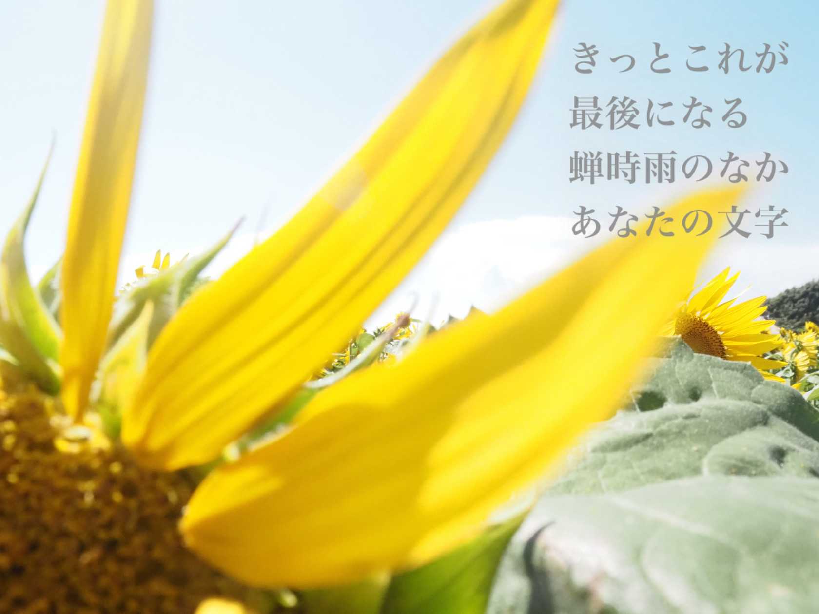 きっとこれが最後になる封をした春は彼方で蝉時雨のなか届いた剥き出しの葉書 よれた文字静かに身を閉じてゆくその光の在り方を今、ただ、見つめていますもう渡すことのない赤い花をこころに描くよまたひとつ 増えるロウソクにもう微笑むことはなくてもおめでとうと言わせてねありがとうと言わせてねきっと何年経っても誕生日には花束をいつまでも“貴方”と呼ぶその距離の在り方すら今、ただ、あたたかいのですまだ渡せないでいる青い花をこころに描くよ限られた 時間の欠片をわたしにもわけてくれたからおめでとうと言わせてねありがとうと言わせてねきっと何年経っても誕生日には花束をきっとこれが最後になる蝉時雨のなか あなたの文字