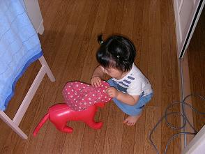 今日は朝からむし暑かったですね~みりみりちゃんも今日は一日中グズグズ言ってました^^;ようやく寝てくれてホッと一息です月曜と火曜はなーーーんにも予定がなく、しかも雨が降ってるから家でまったりしてます、明日も予定がないな~。忙しい日と暇な日の差が激しすぎるぅ・・・朝、掃除機をかけてたらみりみりちゃんが犬のぬいぐるみと遊んでいました。いつも掃除機かけると、大きな音が嫌みたいで泣くのだけど珍しく大人しいここぞとばかりに隣の部屋の掃除機をかけてふっとみりみりちゃんを見ると、ワンワンに帽子を被せていましたワンワンに向かって「☆■△※ね~」って何か話しかけてます。きっと「かわいいね~」てゆってるのかな?ワンワンかわいいです”ぐるぐるどっかーん”が始まったらテレビの方へワンワンはそのままほったらかしでした・・・子供って飽きるの早いよね 先月、楽天で買ったミキハウスの白いサンダルがもうキツくなってきましたショック(>_