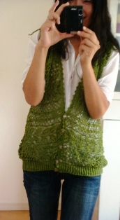 帰省したときに母のコレクションの中からいただいたボタンを付けて、ついに完成しましたカギ針編みと棒針編み、どちらも駆使して、短冊のような形のパーツを作ってから、つなげるという方法で、今まで作ったものの中で、一番難しかったです。しかも、リボン状の糸を選んでしまったので、編みにくいわ、ゲージは合わないわで今は冬物のカーディガンを編んでいます。20年以上編み物をしているのに、一向にスピードが上がらないのはなぜ