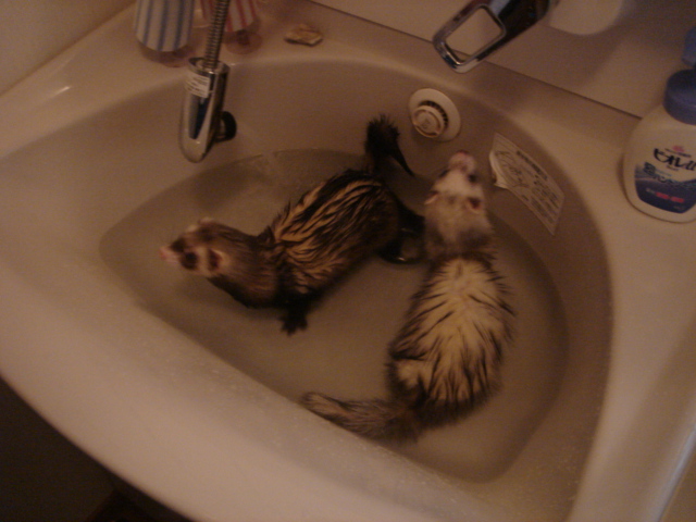 こんばんは。 miiです。先日こちらで宣言(!?)したように、仕事に本腰を入れ始めたワケですが。仕事、楽しいんです、本当に私にとって 天職なのかもしれませんかれこれ5ヶ月経ちますので、大体の流れも覚え、の説明も多少はそれらしく出来るようになったし。私って、こんなに接客業に向いてたなんて~~ 何より、「人脈」に恵まれました。 皆とても良くしてくれるので、仕事に行くのが全然苦ではありません。それどころか、楽しくってルンルン♪ くらいかも。今、世間は不況で、職に関する心配事が多々報道されてますが、とりあえず安定してる我が職場。本当にいい縁で、いいタイミングでお世話になることになり、わたしは幸せ。ますます頑張って、ぜひ恩返しがしたいな。来週から、桜にちなんだ催しが開催されます。忙しくなるぞ~~!!!~~~~~~~~~~~~~~~~~~~~~~~~~~~~~~~~~~~~~~~~先日暖かい日に、久しぶりにフェレズをお風呂に入れました。場所は洗面台~画像が暗くってすみません「こわくないからねぇ」 担当はもちろん naa です。なぜか、二人同じ動き漂う動きが、同じ方向そして、またシンメトリークク、とっても気持ち良さそうだったのですが、お伝えできてないかな。でも、お風呂中、ずっとトイレを我慢してたらしい クク。(みるだったら、しちゃうんですが。。)上がった後、 ちょっと大変な事態でしたブログランキングに参加してます!! 日々の励みに、応援ポチッと ありがとうございます♪