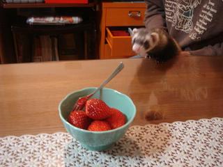 こんばんは。 miiです。暖かい日が続きましたね。 かと思ったら、夕方から急に寒い明日は今日の半分位の気温ですって。こんな陽気だと、体も思うように動きません~~去年は軽かった私の花粉症も、今年は活発に活動の予定みたいです。私は、体のかゆみと、喉にくる症状がひどくって、今朝は 午前中ほとんど、声が出なくって困りましたこれじゃあ、仕事になりません~~~~~~~~~~~~~~~~~~~~~~~~~~~~~~~~~~~~~~~~~~~フェレットって、バナナが好きらしい。そういえば、おやつにも、バナナ入ってるかも。と思って、昨日ククにバナナを差し出してみたところ警戒することもなく、食べた。 しかも、超 美味しそうに~!!!じゃあ、今晩のデザートはこれだ!!!!!!!いちご♪お行儀よく待ってますよ。やっぱり、待ちきれなくって、暴れてます。ククはこれが食べ物か、そうじゃないかに敏感で、食べ物を前にすると、なんともかわいい顔をします。それが可愛くて、ついついあげちゃいます。 もちろん、いちごも大好物だったようですブログランキングに参加してます!! 日々の励みに、応援ポチッと ありがとうございます♪