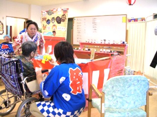 金曜日に、特養併設のデイで夏祭りがありましたので、利用日を変更して参加して来ました。射的があったり、ヨーヨー釣りをしたり楽しく過ごして来ました。11時頃から、ルーム内は良い匂いが漂い、原因は“たこ焼きと焼きそば”でした。たこ焼きは、大きなタコ入りの、表面を油でカラッと揚げた“とろ~りタイプ”で、焼きそばは、スパイシーな粉末ソースで焼いた、良い匂いのする焼きそばでした。他にも、こんにゃく田楽や、から揚げ、ウインナー、のり巻き、いなり寿司、枝豆、前菜には?“流しそうめん”がありました。飲み物も配って頂き、やはり祭りときたら“ラムネ”でしょう!次々と配っていたので、焼きそばは2杯目です。たこ焼きとから揚げは、もう少し食べたかったけど、お腹が出るので控えました。午後は、スイカ割りと民謡踊りをやり綺麗なお姉さんとパチリ!最後に、射的の成績発表!私は、第4位に入賞しました。(と言っても、第4位は7人もいましたけどね!)中身は内緒!翌日もお祭りを行っていたようですが、さすがに連チャンは控えましたよ!