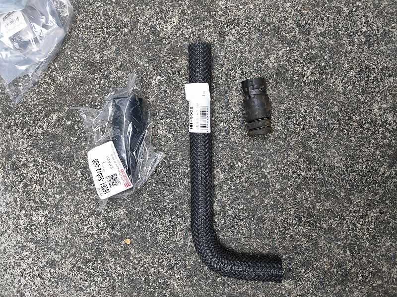 サーモに繋がるホースは新品が出たが、ヒーターホース部は出なかったので(というかモノタロウには無かった)、汎用のホースで代用。長いものを切って使う。