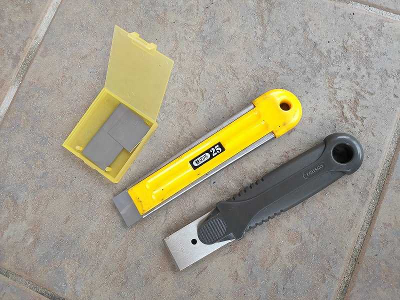 KTCのスクレッパーがあったはずなのだが、どこに行ったか分からなかったので、ステッカー剥がしに使っていたOLFAの「鉄の爪」で作業を開始。ところが、替え刃が無かったので刃が古いまま使用していたためか全然食いついてくれない。三時間ぐらい作業したのだが、全然進まずタイムアップ、というかやる気が失せて終了。