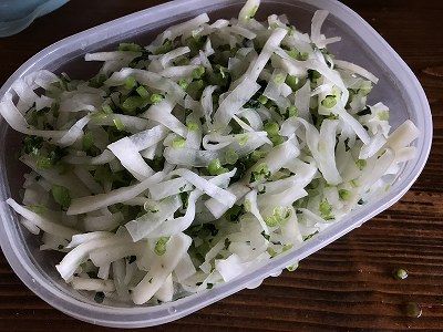 最初に混ぜると、ほんのり緑色の大根になるので。