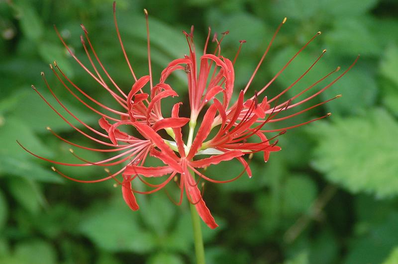 昨日は半日晴れて、布団も干せた那須ですが、今日は一日中雨、明日も雨とか。今年ほど9月になってから雨が降った年は思い当たりません。さて、丁度お彼岸ですが、我が家の庭にヒガンバナが咲きました。なかなか綺麗ですし、海外でも人気があるそうですが、日本では墓地の周りに植えられていたり、死人花なんて別名もあって、余り歓迎されていないようです。別名の一つ「曼珠沙華」は、「まんじゅしゃげ」と読みます。山口百恵の歌で「まんじゅしゃか」と呼んだので、カチンときた覚えがありますが、サンスクリット語の「天界に咲く花」は「マンジュシャカ」でも、日本語の読み方は、「まんじゅしゃげ」です。ちなみに、ヒガンバナ球根植物なのですが、毒がありますから、間違っても食べないように。水仙も同じで、食べて死んだ人もいます。