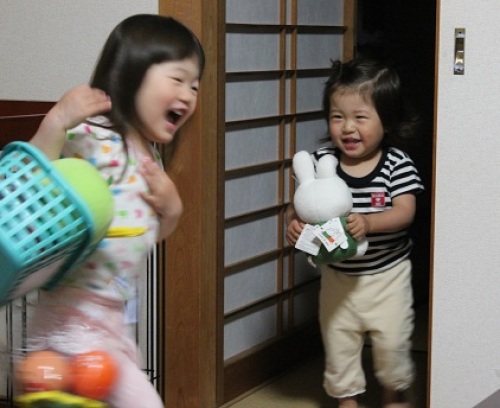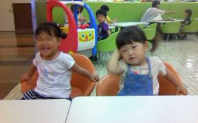 昨日のタイフーンは凄かった~6月に台風が上陸したのは8年ぶりだったそう。よりによって雨風が一番ひどい19:30に帰宅中だったわたし。車はぐわんぐわん揺れ、マジで横転するかと思ったぁ某松並木沿いに住んでいる我が家ものすごい量の松が駐車場に飛ばされてきていました。翌日、外に出たみんみんが『ばっちぃ・・・』と言ったのが印象的そんな台風一過のこの日、久しぶりに平日休みが取れたので、1年ぶりのお友達に会ってきました~。出産前の母親学級で知り合ったIさん。連絡先は交換していなかったのですが、出産時に病室が偶然一緒になり、 再会を果たし仲良くなったお友達です。みんみんの3日後に生まれたHちゃん。小さい小さい赤ちゃんでしたが、会うごとにぐんぐん成長し、1年ぶりに会ったこの日は外見も中身もすっかりみんみんを追い抜いていましたヨこの日もIさんとHちゃんが現れると急に固まり、目も合わせないみんみんに対し、片や手をひらひらと振りながら、ニコニコ顔で登場してくれたHちゃん。社交的で本当にうらやましい。。。おそらく頑固娘を演じ続けたかったみんみんですが(推測)、Hちゃんの積極性と活発さに触発され、手をつないで歩いてもらい・・・いつのまにか打ち解けていたようでした お互いマネしあったり、『自分も!』と張り合ったり、2歳目前の2人の絡みはホント見ていて飽きないなぁ~ママ同士のおしゃべりも1年分を取り戻すかのようにスパークしてました 不覚にもこの日はカメラを忘れてしまい・・・携帯で撮った残念な写真のみ。今度は1年もたたないうちに会おうねっ