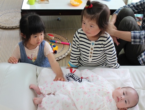 おめでたいおはなしらーちゃんに妹が生まれました~従姉妹が増えてますますにぎやかになりそうなんとらーちゃんは出産に立ち会って、1番に抱っこしたんだって。『赤ちゃん、持って帰る~』と、一気に姉性爆発だったみたいです。うん、素晴らしい!そんなワケで、妹ゆーちゃんとママが入院している間、らーちゃんはばばちゃん家にお泊りしてるのですが。。。3歳を目前に暴君と化しているらー姉みんみんとのモメゴトが毎日続出でしたやっぱり1つ年上だとケンカの迫力も違いますね~。歯が出る、手が出る、、、で、みんみんも負けたくないから全力で応戦。この数日間でみんみんの凶暴性も5割増し・・・といったところか。らーちゃんの口癖、『もうっ』もすっかりマスターしちゃったよ。。。姉妹よりは遠くて、友達よりは近い関係の2人、仲良くできる時もあるのですが、まだ年齢的にライバル視の方が多くて、お泊りの1週間はお互いにストレス溜まりまくりだったようですみんみんも夜泣きがヒドイ1週間でした・・・ 貴重なHAPPY SHOT ゆーちゃんの退院前日、みんなで会いに行ってきました。生後4日のゆーちゃんはちっちゃい、ちっちゃい。こんなだったっけ~ 時が過ぎると本当に忘れるわー。俺が、俺が!!!! らーちゃんとみんみん、奪い合うようにして何回も抱っこ。あたいの妹~ この真剣な表情(笑) 赤ちゃんを初めて抱っこしたみんみん。忘れがたい体験だったようで、家に帰っても『あたたん、あたたん』と興奮冷めやらぬ様子でした。みんみんにもいつの日か妹か弟ができるといいねっ(←あくまで他人事~)