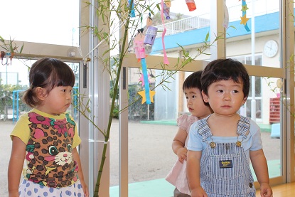 七夕の土曜日保育園の乳児クラスの七夕会がありました。普段みられない保育園での姿が見られる貴重な時間。保育園に着いてクラスメイトを見つけると、みんなの名前を得意げに呼び、とっても嬉しそうなみんみんほぉ~、普段はこんな感じでみんなと絡んでいるのね~。 親子で七夕飾りを作り、笹に飾りました。みんみんの今年の願いは『アンパンマン様に会えますように』(母:代弁)叶うといいね~その後、DVDで普段の保育園での様子を見せてもらいました。リトミックをやったり、みんなでお散歩に行ったり、タライの水に芋洗い状態で入っていたり・・・ホントにみんな楽しそうで可愛いぐぅたらかーちゃんと2人で家にいるより、よっぽど有意義な時間を過ごせているなぁ~と改めて保育園には感謝!DVDのあとは七夕の歌をみんなで歌い、先生の羞恥心丸出しのかわいい劇を見せていただいて終了でした。普段顔を合わせることのないクラスママ達ともお話ができて有意義な会でした あんぱんまんさまぁ~ この日は夜にみん家の住む町の花火大会が予定されていました。午前中は残念な雨でどうなるかと思っていたのですが、午後からはぴーかん去年は震災の影響で開催されなかったので、みんみんにとっては生まれて初めての花火いただきものの某猫ちゃんの甚平を出してくると、『早く!それを俺にくれ!!ギブミー!!!』という感じで、大興奮のみんみん。いつもののんびり屋が嘘のようにすばやい動きで着衣し、ダーっと走って靴を履きに行ってしまいました。甚平、相当嬉しかったんだね 2台のベビーカー、どっちに乗るかという小競り合いもありましたが、意気揚揚としゅっぱーつたくさんの人や出店でお祭りムード満点で、テンションも上がっていきます。会場に到着して、いよいよ一発目ドーーーーーーン!という音とともに、、、、、ハイ、号泣キタ━━━( ´∀`)・ω・) ゚Д゚)・∀・) ̄ー ̄)´_ゝ`)ノД`)・゚・。━━━!!!!!その後、ずーーーっとかーちゃんにしがみつき、咽び泣き続けましたよ・・・ ↑注:出発前の写真と同一人物です。テンションの落ちっぷり、高低差ありすぎて耳キーンなるわ!!!(@フット後藤)『おうち~、おうち~』と泣き続けるみんみんと、眠くて『帰りたい』と言い出したらーちゃん。結局30分ほどで早々に退散するハメに花火大好きなかーちゃんにとってはなんとも切ない結末でした。。。帰る道すがら、スターマインが上がるとベビーカーをそちらに向けてみんみんに見せてあげようとしたのですが、大仏のように目をつぶり、絶対に見てはくれませんでした・・・頑固者! ●○●○●○●○●○●○●○●○●○●○●○●○●○●○●○●○先週末、ご近所の7月生まれトリオで遊びましたー小さい頃からみんみんと顔が似ていると評判のOくん。相変わらず双子フェイスの2人、可愛かった女子二人はステージで歌い、踊ってましたみんみんより1週間小さいYちゃんはホントにしっかり者。階段を登って並ぶ滑り台も1人で登ってちゃんと並べる!びっくり来月には立派なお姉さんになるんだもんね そんなメンズ×1、レディース×2のDAISUKI編成(昭和的表現)あぶれた女子はかわいそうよねーーな一枚をどーぞ。べ、べつにうらやましくないし!