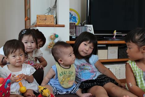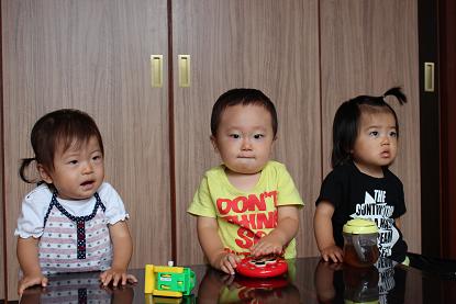 今日で楽しかった夏休みも終了8日も休みだぁ~と、始まる前はわくわく感がハンパなかったけど、やっぱりあっという間に過ぎてしまいました今年の夏休みはとーちゃんの実家に帰省しなかった分、いろんなお友達とたくさん遊ぶことができて、かーちゃん的には大満足今、海外赴任にしているお友達が4人もいるので、日替わりでみんなに会う感じでした最初はアメリカに赴任している友達を交えて4親子でお友達のに集合 えへ・・この日集まった子供たちは年齢が5歳~0歳で、女の子5人、男の子は1人だけ。おうちを提供してくれた友達の子が女の子4歳なんですが、家のおもちゃをみんなに使われるのがなんだか気に入らない様子。『もう、みんなイヤだっ』とすねてしまったり、最終的にはトイレも貸さないって言い出しちゃって、お母さんは困っていましたが、わたしにはその気持ちもなんだか良く分かるので微笑ましいものでした。急にガヤガヤと大人数でお邪魔しちゃってゴメンねでも母同士はかなりの盛り上がりで楽しく過ごさせていただいたよっタメな2人。 うっきょー! ネム・・・別の日にはインドネシアに赴任しているお友達が我が家に遊びに来てくれました。ここんちは小学校2年生のお姉ちゃんと年中さんのお兄ちゃん。このお友達は数年会わないってこともザラなお友達なので、お兄ちゃんとははじめましてだったし、お姉ちゃんとは0歳児以来の再会でした2人ともインドネシアで真っ黒に日焼けしてました。シャイな2人で、ガツガツくる変なおばちゃんにひいちゃったかな・・はは。大きい子のおもちゃがなくてどうしよう、と思ったんだけど、マリオにガッツリ食いついて、ずっと楽しく遊んでくれてよかった~2人に『日本とインドネシア、どっちがいい?』と聞くと、食い気味に『にほんっっ』との答えが。トイレが汚い~というのをしきりに言ってました。やっぱりアジアはまだ整備されてない部分が多いもんね。大人はそこもアジアの魅力と捉えても、子供はイヤだよね。次は春に帰国予定とのことなので、みんみんも一緒に遊べるかなぁ。 プリンプリンプリンプリン・・・夏休み最終日にはタイに赴任しているお友達と3親子でプールに行きましたぁみんみん、記念すべき初プールプールの写真も撮りたかったのだけど、禁止とのことで残念。まぁ、プライバシーの問題から仕方ないけどね。わたしは集合に遅れてしまったので、もうお友達の子供たちはガッツリ泳いでましたみんみんも最初は下ろそうとすると『ふぇ~ん』でしたが、徐々に慣れて、自分でも水をぱしゃぱしゃ弾いて遊んでました友達んちの元気なおねえちゃんに水をバシャッとかけられ、『ふぇ~ん』の場面もあったけど、かーちゃんはそれすらも面白かった大満足のプールをあとにして、SCに場所を移してランチをし、子供の遊び場で少し遊びました。お友達の子は2組とも年長さんと2歳児の2人。でも、2組の子供たちはキャラが全く違う。片方は女の子2人だけど、元気がありあまってる感じで、全く物怖じしない。もう片方はお兄ちゃんと妹、シャイで思慮深くて落ち着いてる。遊び方も全然違うのがおもしろかったぁ~かたや頭から滑り台を滑ってくるおねえちゃん、かたや黙ってソファにじっと座ってるいもうとちゃん。みんみんはどっちのタイプになるのかなぁ。次に会ったときは少しはキャラが立っていることを期待して・・・次回の帰国時も絶対遊ぼうね~ 1さ~い!おまけ。お盆ならでは10年ぶりに会う従兄弟の子とも初対面を果たしたよ は、はじめまして