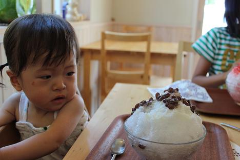 週末は素敵なカフェに行き、女子度満点に過ごしました土曜日はかーちゃんの大親友と古民家カフェへランチにここは細い道をくねくねと入っていくと、ひっそりとあるとても雰囲気のあるお店。お庭も綺麗に手入れされていて、池には鯉が泳いでいます。まさかこんな場所にこんなお店がって感じのトコで、まるで白昼夢をみてるような感覚になる場所。とっても身体に良さそうな野菜たっぷりのランチをいただきながら、マターリと過ごしましたみんみんは持参のクリームパスタをたいらげ、ランチについていた人参とカボチャの冷製スープをあげたら、えらく気に入ってがぶがぶ飲んでました。美味しいものは子供に譲るって人ではないので、2人で取り合いでで。この日、とっても嬉しい報告が。お友達に赤ちゃんができました来年の1月に生まれるそうで、まだまだ心配な時期ではあるけど、無事に会えるように祈るばかりです。すっごく楽しみぃ~ 日曜日は大きいお姉ちゃんたちと夏の風物詩のかき氷を食べにかわいいカフェに行きましたほぉ・・・これがかき氷 こちらは前日のカフェとはうってかわって、ログハウス風のかわいらしい建物。かき氷もふわっふわでチョー美味しかったですみんみんはまたもおあずけで、ひとり持参のヨーグルトをかっくらってました1歳にしてカフェを満喫している日々で、女子力満載。将来2人で更なるカフェめぐりが出来る日が楽しみです素敵カヘ★