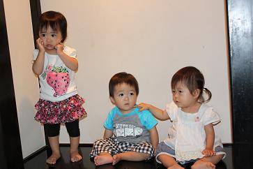 今日の台風はスゴすぎた・・・会社の帰りも至るところで停電してて、信号も点かないから町は真っ暗。警察官が手信号してましたなかなか見れない風景だったなー。週末日記。日曜日、月1恒例となりつつあるママランチでした今回は某有名ステーキ屋さんでまたも個室を占領。この時期の1ヶ月はとても大きく、みんなまたグンと成長してました『おいちー』や『よいちょ』などおしゃべりも上手に3人でコミュニケーションもだいぶ取れるようになってきて、スポットライトの下(床の間・・・?)で絡んでる様子はキュン死にしそうに可愛かったです来月は今回来れなかったおともだちも来て、もっと一緒に遊べるようになってるかな にこっ ちょっと迷惑・・ 『にこ』ってこうやるの! そして就寝 月曜日はわたしの高校時代のおともだちの家に集まる予定でしたが、高熱が出てしまった子がいたので当日中止にわたしは手土産を用意する係りで、前日にたんまりスィーツを買ってしまっていたのです1人でも余裕で食べ尽くせるけど(オイ)更にビッグママになってしまう・・・と危惧して、ご近所の友達のうちにお土産として届けがてら遊びに行くことに。選んだケーキはずっと食べてみたかった『ミルキークリームロール』ミルキー三姉妹 何故かみんな顔がこわばってる・・ 包み紙からテンションがあがる一品ですスポンジがふわっふわで練乳風味のクリームもめちゃくちゃ美味女子5人で(みんみんはスポンジだけ)取り合いながらいただきました。おいしゅうございましたスポンジを少し食べたくらいじゃ納まらないこのヒトバナナをいただいて、見事な1本食いで腹を満たしておりましたそのあともおねえちゃん達に交じってシルバニアFで遊んだり、wiiをやってるとこ邪魔したり、たっぷり楽しんだ挙句最後は眠すぎてパニックを起こして退散本能の趣くままのみんみんなのでした・・・コレ、あたいの人形だし!