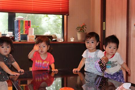 8月ももう終わり・・・去年の夏に比べて、格段に涼しいような気がします。朝晩は涼しい風も感じて、夏の終わりってなんだか寂しいですさて。週末は産院で仲良くなったママ達と4組でランチに行って来ました6・7・8月産まれの4人おぃーっす大きさ的にも動き的にも成長はまちまちで面白い。髪の生えそろい方も歯の数もみんなバラバラ。まだ一緒に遊ぶって感じじゃないけど、お互いの存在は意識してて可愛かったっす~みんみんも刺激を受けたか、急にローテーブルに登り出してビックリよいしょーっと!あなた、そんなアクティブな人でしたか・・・?でも、動けるようになって本人はとっても嬉しそうレベルUPおめでとう散々いたずらしたあと、4人とも揃っておねむの時間に突入したので、ママ達はデザートとおしゃべりを満喫できましたかーちゃん以外はみんな若いママばかりだけど、話題は尽きず。17時前までランチで個室を占領してしまったよ・・へへ来月も集まる約束をして解散しました~。帰宅後は、ひとつ年上のみん従姉妹のらーちゃんが泊まりに来たので、追いかけっこしたり、花火をやったり、ガッツリ遊びましたと、とーちゃんの手がないぃぃこのらーちゃんがまたおてんば娘で。かーちゃんは逃げる2人を抱えたり、椅子に乗せて運んだり。老体にムチ打って働かせていただきましたヨ・・・翌日曜日はばばちゃん、らーちゃんと共に公園へ水遊びへみんみんは鼻タレだったので、水着には着替えなかったけど、足だけ水につかってとっても楽しそうでしたしかし、まだ一人で歩けないからずっと後ろでささえたり、抱っこしたり・・・かーちゃんはへとへとでしたよ来年はらー姉ちゃんに子守をお願いしたいでやんす。ススメ!ススメ~!