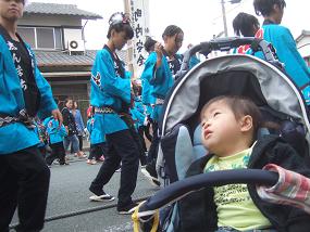 10/10・11は地元のお祭りでしたみん家のあるM町のお祭りは旧暦で行われるため、毎年日にちも曜日もまちまちで、2日間とも平日なんて年もあります。学校も休みになっちゃうのです生まれた時からこの町に住んでいるかーちゃんはこの風習が自慢だったりします今年は保育園からも『お祭りの日の保育を希望しますか?』なーんてお手紙もきて、祭りが熱い町の保育園ならではだなぁと実感。みん家はもちろん親子でお休みし、違う町に住んでいるいとこのらーちゃんも保育園を休ませ、たっぷり見学してきましたお疲れっす~手踊りが休憩に入る時にはお菓子を配るので、どこまでも追いかけお菓子をもらい、屋台にたどり着くと法被を掲げ、マラドーナばりにアッピールするばばちゃんお菓子GET!・・・おっとコレは去年のみんみんでした絶対泣くと予想された大太鼓もじーっと見て、ノリノリで手を叩いていましたあたいに叩かせろ~ zzzz・・・・さすがM町の血を受け継ぐ子供だぜ今年の手踊りはマル・モリやKARA、少女時代、EXILEまであって見ている方も楽しめる選曲でした子供たちのお尻ダンス可愛かったぁ~みんみんも2年後くらいには踊れるようになるかなぁ・・・想像するだけでキュンキュンしちゃいます来年は法被着て、歩いて参加しようね~今年は捉えられた宇宙人状態ですけど!