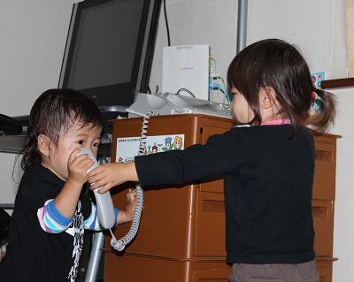 昨日は従姉妹らーちゃんが遊びに来ました~ここんとこ、会う度に成長が目覚しいらーちゃん。おしゃべりもだいぶはっきりし、状況の把握もきちんとできているようです。『ママのお腹にはなにがいるの?』と聞くと『あかちゃん!』『じゃぁ、hatchちゃん(わたしのことです)のお腹には?』 『・・いない!』お、おぅ、、良く知ってるやんけ昨日はばばちゃんが用事ででかけたため、3時間ほどひとりでみんみんとらーちゃんのお相手をしたのですが・・・まーーーー∞ 疲れたOLごっこをしていただき、15分、みんさーん、2番に外線です!2人でカタカタレースをしていただき15分、早いでやんすよ~、おやびんもー家遊びは無理!と散歩にでかけて45分、飛ばすよ!しっかりつかまってな!帰宅後バナナジュースを作って召し上がっていただき、・・・・・・・さ、みんな寝よ~うと声高らかに誘うも・・・誰の賛同も得られず撃沈最後は起き上がる気力もなく、寝転んだまま『うん・・・うん・・そうだね・・・』と力なく応えるのが精一杯だったわたし。ばばちゃんが帰ってきて、『なんだかとっても眠いんだ・・・』とネロ(@フランダースの犬)のようにつぶやき、そのまま深い眠りへ入っていったのでしたそれにしても幼子2人をひとりでみるのがこんなに大変とは年の近い兄弟姉妹がいて、家で子供と過ごしているお母さんってホント尊敬しますわ・・・ 夜、PCでとーちゃんの写真を見て、『たったん、たったん』と言っていたみんみん。やっぱり寂しいのかなあと1週間だよ~頑張ろうぜ
