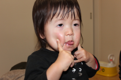 身長:不明体重:8800gこちらの言葉がだいぶ通じるようになった。 『ポイして』 『ないないして』でゴミを捨てたり、物をしまってくれたり・・・ 使えるようになってきたぜ 1番覚えて欲しかった『ありがと』でおじぎをついにマスターした! おじぎしまくって生きていくのだおしゃべりもだいぶ上手になってきた 『たーた(茶ーちゃ)』『ばーば』『わんわ』『まんま』 『イヤっ(驚くほど鮮明な発音)』『パン』は自分の意思で使っている。 あとは大人が言ったことを真似しようと必死。 歯は上下3本ずつの長い時を経て、 奥歯じゃなく小臼歯あたりの変なところが上下ともにょきにょき生えてきた。 歯磨きは相変わらずご立腹 でも、『はみはみする?』と聞くと、 自分の指を歯ブラシに見立てて磨くマネする。 めちゃんこカワイイ食欲も相変わらず旺盛過ぎる 長州小力バリの腹の出具合・・・おっさん化が進む・・・ 外食時も取分けだとこっちの分が足りなくなるので、 お子様ランチデビューしました。 相変わらずのパン狂い。 ひたパンがお気に入り。オサレ女子ぃ~ 嫌いなものはあんまりないみたい。 肉も野菜ももりもり喰らう。 最近はばーばとかーちゃんと女子3人でみかんを食べる時間が幸せ 最後の1個をかーちゃんが食べようとすると 『イヤ、イヤっ』と阻止しようとする。 ま、譲りませんけどね足がだいぶしっかりしてきて、 階段もびっくりするようなスピードで昇りきる。 すべり台も一人で登って滑れるように 1人でたっちも7秒くらいはできる(・・記録がしょぼい) 保育園では靴デビューして、コンビカーなど押して歩いてるそうです『こぶたぬきつねこ』『結んで開いて』『いないいないばぁ』の 振りもできるようになった。 保育園様様っす~後ろのちょろ毛をついに切る・・・つもりです・・ でも、横の髪が1ミリも伸びないので、 後ろを切ると小猿そのものになりそうで、、、怖い成長目覚しい時期なのか、いろんなことができるようになって見応えありです