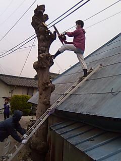 懸案だった、屋根の工事が、ようやく始まりました、実家のオカンです。まず、道との境にあり、屋根にかかっていた柿の木を、お清めをして、ばっさり切っていただいたそうです。5月、GWには、ここまでして、結局切れなかったんですが。プロは、バッサリ我が家は100年以上前からの古民家なのですが、わらぶき屋根に、トタンがかぶせてあります。瓦の部分もありますが、トタンの塗り替えが、数年おきに父の仕事でした。父が亡くなり、ペンキがはがれた屋根は、見るも無残で、母はずっと気にしていました。近所の屋根やさんに、依頼してたのですが、田舎の口約束の仕事ですから、半年くらい放っておかれて、母も怒ってました。ところが、先日18日に突然やってきた屋根やさん。明後日からやります。4日でやります。駐車場の手配と近隣の方へのご挨拶をお願いします、と。母もびっくり~~~。弟2号からの写真が送られてきました。・・・4日間では、終わりそうにないなぁ~、とメール。