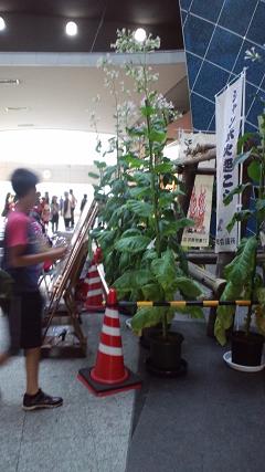 タバコの花をご存じない方が多いみたいなので、今日、もう1度、写真を撮りに、駅に行ってきました。全体はこんな感じ↓↓↓2.5メートルくらい?↑↑↑葉っぱは大きくて、これが、タバコになるのですが、収穫して、干して、出荷後、乾燥して、商品になるまで、2年かかるとか。育てるのに約1年、更に2年も工場にいて、製品になるのだそうです。詳しくは、JTのサイトこちら。花は、これ↓↓↓今日から、たばこ祭、始まりました。晴れ上がり、爽やかな日になりました。節電を考慮し、提灯が今年はありません。なんか、寂しいと思いましたが、今年は花火が、多めにあがるそうなので、楽しみです。明日の夕方、6時からからです。