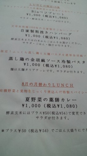 夏休み中、ピグしたり、漢字テストしたり、韓国ドラマを観たり・・・なかなか忙しい小波です。今日は、オットから急きょ、ランチのお誘いが~~駅前のBio食堂に、行ってみました。フムフム、ランチメニューは、お手頃??先ず、セットに組み込まれてるサラダ。キャベツが柔らかく、豆乳マヨネーズが、おいしいっ私は玄米で、8月限定のカレーにしました。爽やかな辛さと、フルーティーな甘さで、美味しいっオットは、ハンバーグに。トン汁と白米で。横から見るとこんな感じ行きつけの美容師さんが、こちらのお店を勧めてくれましたの。次回は、野菜ベジタブルプレート、注文しようっかな~~野菜や素材にこだわってるお店のようです。おばちゃんたちで、にぎわってました