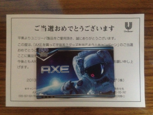 実家に「AEX宇宙キャンペーン」のW賞のクオカード1,000円分が届いてました(^-^)実家と家と1口ずつネットで応募しました。