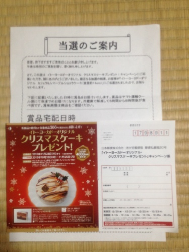 金曜日に実家にイトーヨーカドーのクリスマスケーキの当選通知が届いてました(^-^)
