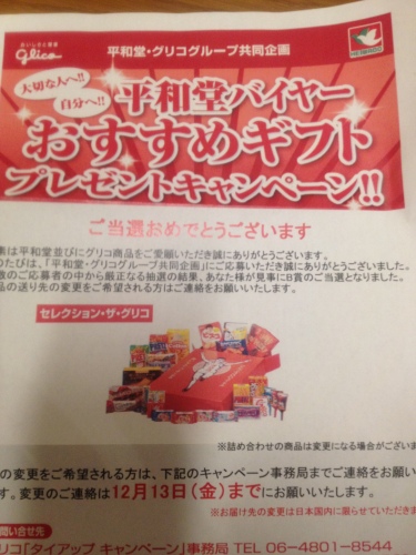 セレクション・ザ・グリコの当選通知が来ました(^-^)贈り先を変更出来るそうです。 クリスマスケーキの引換券が実家と家に届きました(^-^) ペコちゃん&あっちゃんのコラボ人形セットが届きました(^-^)ハガキ1枚と携帯応募1回でハガキの方があたりました。