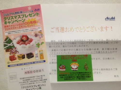 三心とアサヒ飲料のタイアップでクリスマスケーキが当たりました(^-^)1枚応募でした。ローカルスーパーで100名当選はかなり高確率かもしれません。24日は引き換えであちこち回らなければ…
