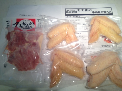 三心と日清オイリオタイアップのキャンペーンで秋田比内地鶏が息子の家と実家に届きました。量少な~っ(^_^;)