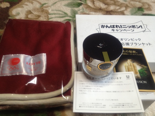 実家のお届け物です。LOTTEがんばれ!ニッポン!キャンペーンのソチオリンピック日本代表応援ブランケットとラックスバイオフュージョントリートメントが当たる!キャンペーンのバイタルリペアヘアマスクです(^O^)/ブランケットは当選人数が多かったので2口出して2口当たりました。
