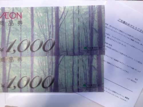 イオンのスーパーマーケット合同キャンペーンで2,000円分の商品券が昨日届きました(^-^)マックスバリュのキャンペーンだと思ったのですがあまり行かないので1枚だけ応募出来ました。