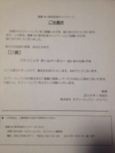 セブンイレブンの創業40周年記念でD賞のパナソニックのホームベーカリーが当選しました\(^o^)/ 携帯で数回応募しただけなのでまさか当たると思いませんでした。 それから…もうひとつ昨日の夜中京TVから電話がかかって来て三重県の熊野の宿泊券が当たった様です。年末にネットから応募したけどよく覚えてないので詳細が来るのを待ってます(^-^)