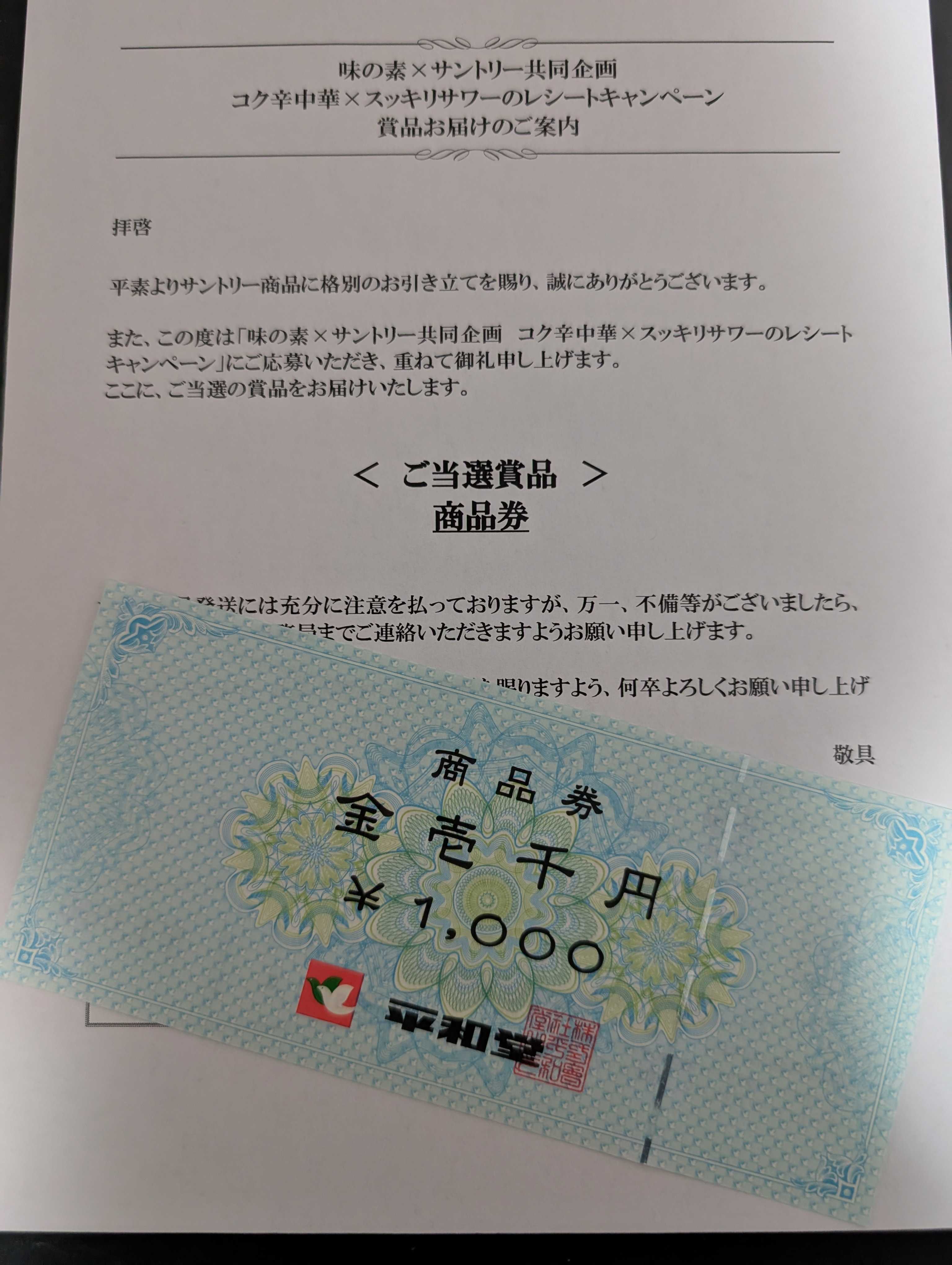 味の素✕サントリー共同企画 コク辛中華✕スッキリサワーのキャンペーンで平和堂さんの商品券当選しました🎉