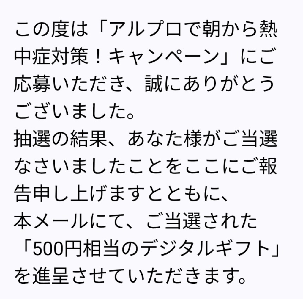 アルプロで朝から熱中症対策キャンペーンでデジタルギフト当選のメール来ました🎉当選者が多かったので1口だけ応募しました😊