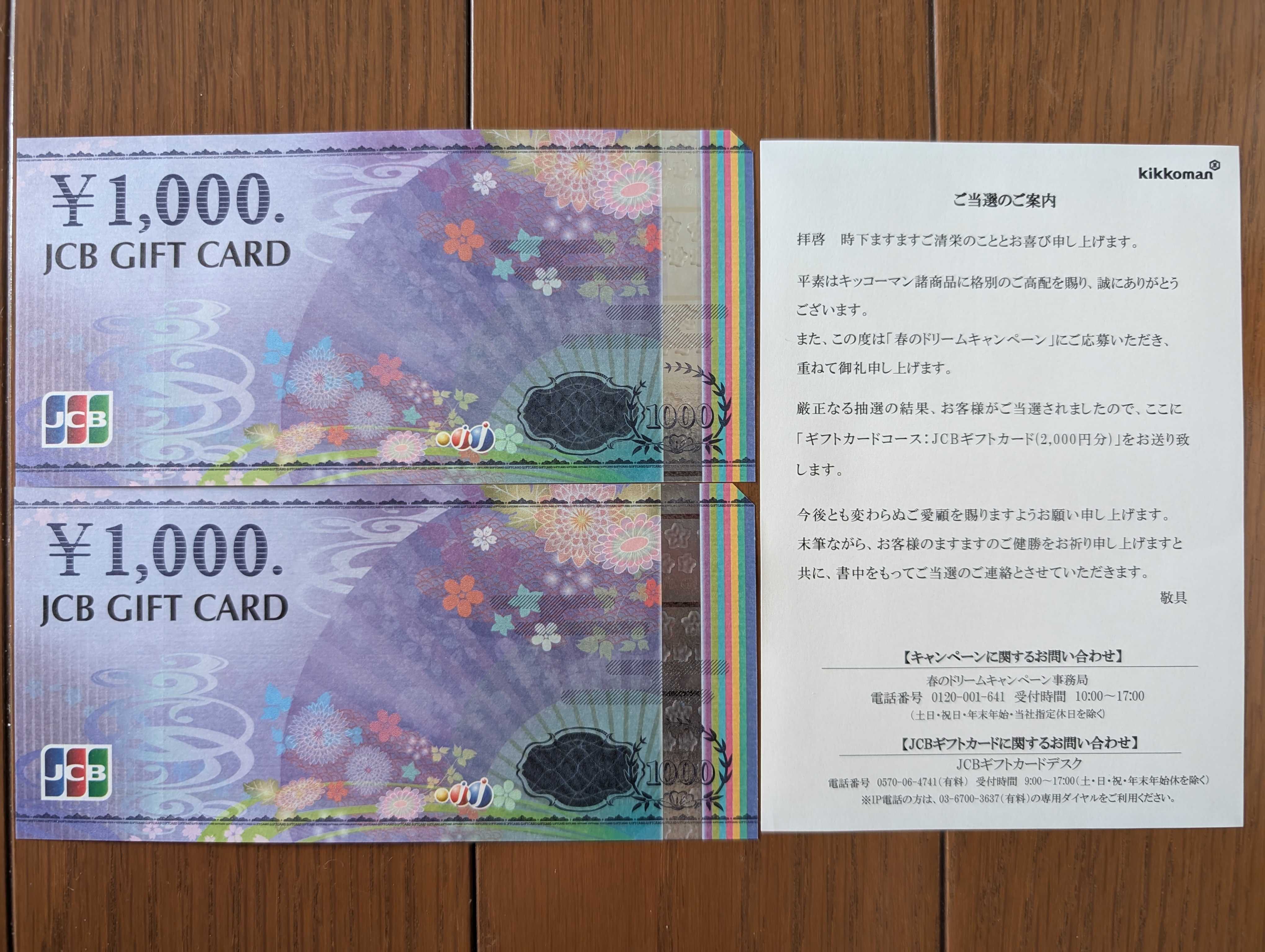 キッコーマンさんの春のドリームキャンペーンでJCBギフトカード当選しました🎉息子宅に届きました😊プラントさんのタイアップです。応募ハガキが無くて普通の郵便ハガキで応募しました😊