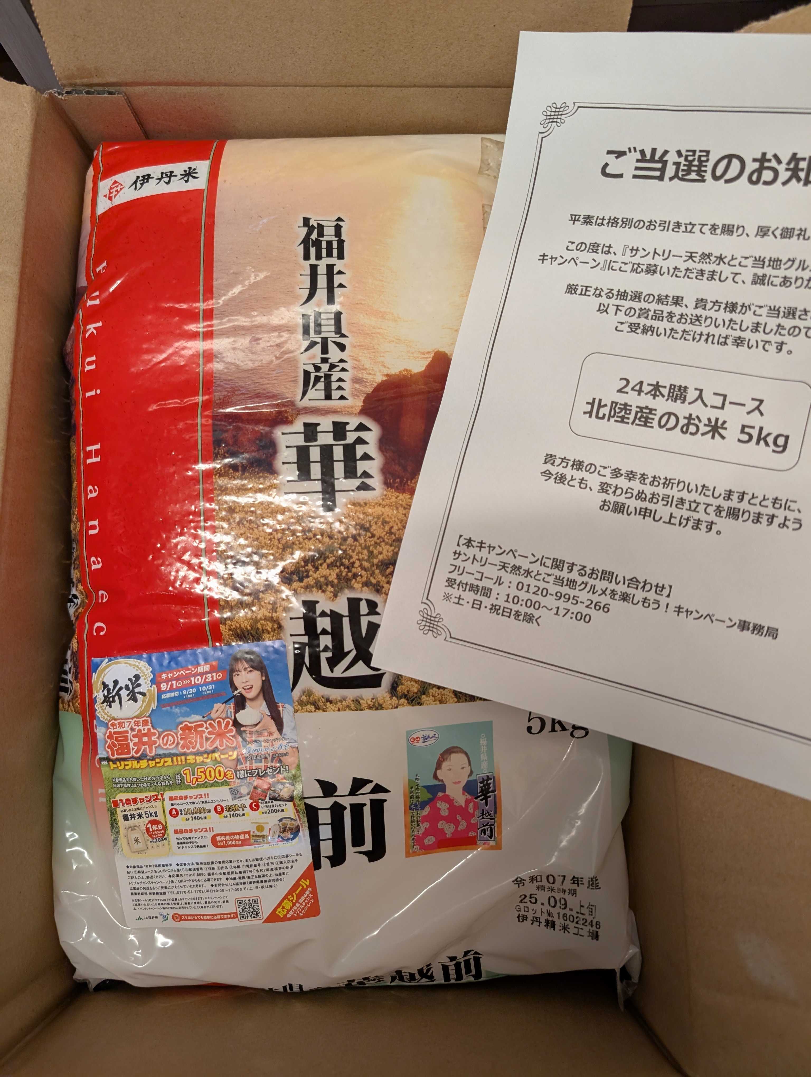 サントリー天然水とご当地グルメを楽しもう!キャンペーンで当確していた福井県の新米届きました🎉
