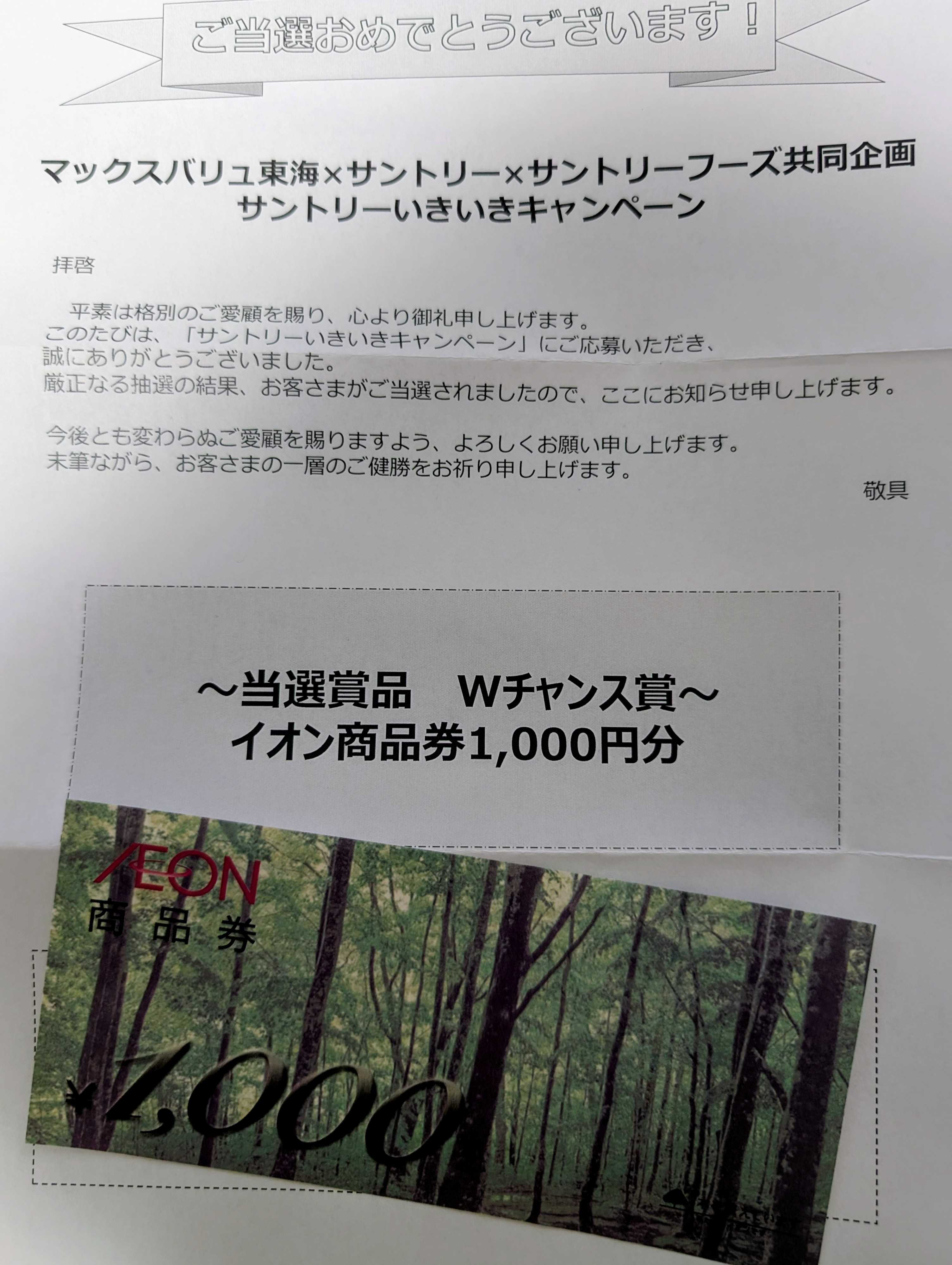 マックスバリュ東海✕サントリー✕サントリーフーズさんの「サントリーいきいきキャンペーン」でWチャンス賞のイオン商品券当選しました🎉