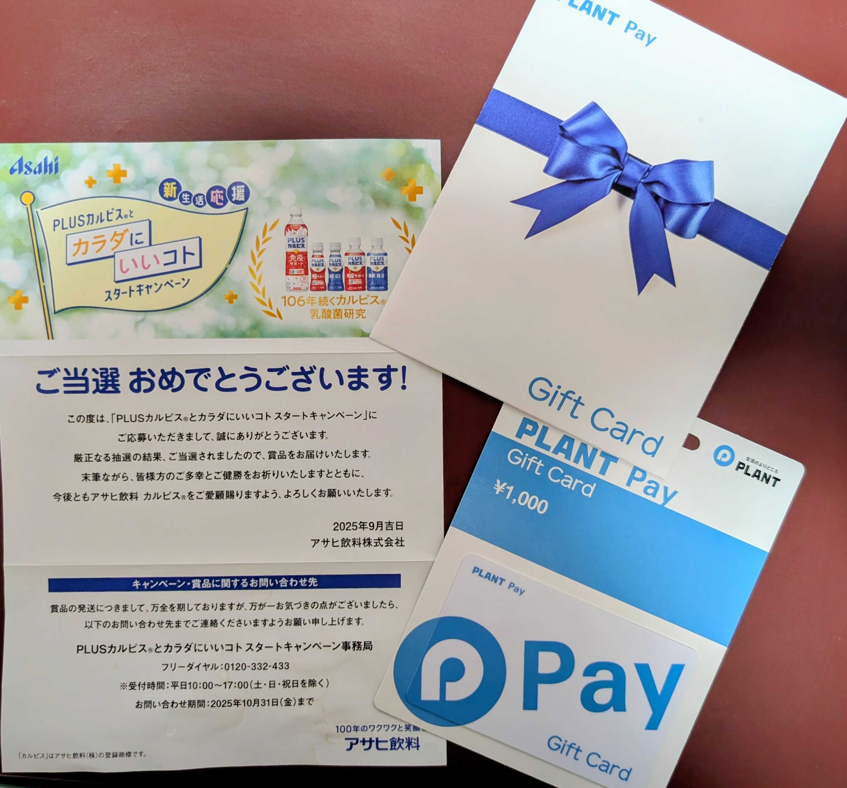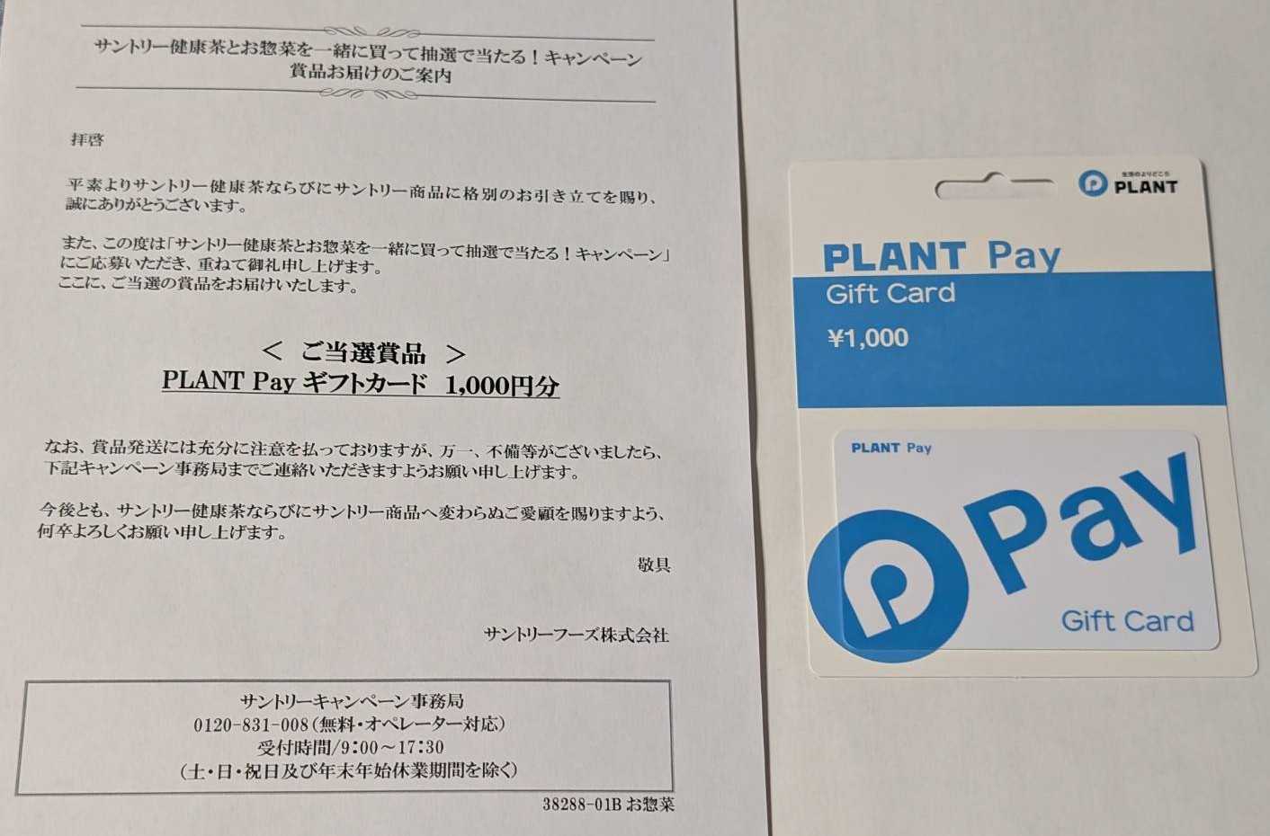 プラントさんとサントリーフーズさんの「サントリー健康茶とお惣菜を買って抽選当たる!キャンペーン」で1,000円分のプリペイドカード届きました🎉中々10,000円は当たりませんね〜😅特茶と半額のおにぎりを買って応募しました💦