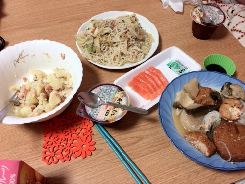 こんにちは。今日は朝からいい天気で日中は暑かったですね。そのような中、今日は三女とつくばまで行った後、土浦のアパートまで送っていきました。その前に当然、イオンで買い物をしたのですが、今日の夜を含め、2日分の食材を購入しながら、晩御飯、明日、明後日学校に持っていく弁当のメニューを考えていました。その三女ですが、一昨日の晩御飯の時、私に対して「高校の時毎日弁当を作ってもらっていたけど、大変だったんだね」と。毎日自分で弁当を作るようになり私の苦労が分かったようです。ちなみに上の写真は、三女のある時の夕食。おでんは、こちらで作ったときに持たせたものです。さて、三女、入学して頑張っているようですが、夏休みが5日しかないようで、その期間に青森に行くので新幹線の切符よろしくだそうです。