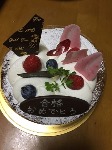 こんにちは。今日はとても暖かい一日で、日中はコートが必要なかったですね。ただ、風が強くて、関東では春一番だったようですが、明日はまた寒いようですね。さて、進学先が決まり、住む場所も決まった三女ですが、今週月曜日からスイミングスクールでのバイトが始まりました。その日、帰って来ての第一声は「体がなまっている」でした。そして、次の日には腕が筋肉痛でいたいとうるさかったです。一昨日は体まなまっているので、ランニングをすると言っていましたが、結局やっていないので、明日のバイト後に、同じ言葉を繰り返すのかも知れません。写真ですが、合格が決まったので三女のために購入したケーキ。合格発表前に、すでに合格祝いでディズニーランドのお金を出していたので何もやらない予定だったのですが、ある人に「やらないの」と言われたのでとりあえず日曜日にケーキを購入してきました。