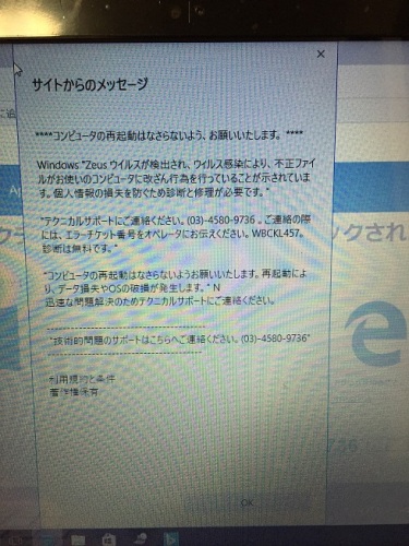 こんばんは。本日、PCを使っていて、ブログを更新しようとしたら上記のようなメッセージと警告音。よく見るとウイルスに感染したため、テクニカルサポートに電話してくださいと。先日TVを見ていたら、コンピューターウイルスの感染したというメッセージが出てそこに電話すると、片言の日本語を話す女性電話口に出ていました。そして、ちょっと診断した結果、2万支払うと異常が回避できると内容だったが、実際はウイルスには感染してなかったようです。しかし、電話したPCの持ち主も高額ではなかったので、疑わず払ってしまうとのことだったので、それを思い出し私も特に何もしませんでした。電話してそれを確かめようかとも思いましたが、さすがにやめました。下は、警告とともに出てきた映像です。先日から、急に以上でPCが異常終了し、再起動する状況が続いていたので、とりあえず、この後はPCを使用せず、コンピューターの診断に出したいと思います。なので、それまではブログの更新もできないと思います。
