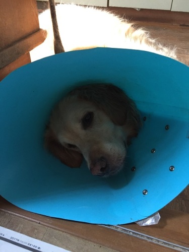 おはようございます。先週の土曜日に手術をした、ゴールデンですが元気にやっています。火曜日に家に戻ってきたのですが、食欲はあっても水はほとんど飲まない状況が続いていました。しかし、水も飲むようになり、今日の朝は散歩にも行きたかったようですが、まだ抜糸も済んでいなくて、傷が開いたら大変なので、我慢してもらいました。現在、2,3日に一回包帯を交換するために、病院に行っているのですが、木曜日に行った際、カラーをしているうちの犬をを見て「え?あれ何」との声も聞こえ、多くの人が私たちを見ていました。今日もこの後、包帯交換のために動物病院に行きますが、縫合した箇所に水もたまっていない状況で経過も順調。このままいくと2週間ほどで抜糸ができるようです