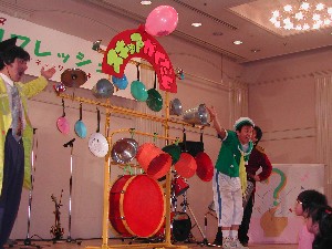 今日は、朝から市がやってる「スキップ楽団と遊ぼう」というのに行ってきました。毎月すみずみまで市の広報をチェックするので、今回も、往復はがきを出して先着100組に当選です!なんか週一回くらいイベントに行ってるような・・・もうすぐ保育所か~と思うと、ついつい「あれもこれも」と欲張ってしまいます。自転車で15分C= C= C= C=(o>ロ)oいい天気だったしね。ご近所のNちゃん&ママに会ったけど、電車&ベビーカーで来てました。電車&ベビーカーだと遠回りになるから40分くらいかかるかな。5人のスキップ楽団というおじさん(4~50歳くらいの・・・笑)達が派手な衣装を身につけて、童謡を歌ってくれたり、みんなで立って踊ったりします。鍋とか、フライパンなんかを楽器にしたものが出てきて、子供達も大興奮でした(´▽`)後から、子供達も触りに行けたしねO(≧▽≦)O みずは、始まる前は、ウロウロ歩きまくってたけど、はじまると意外にも、おじさん達に釘付けでした(○゜ε゜○)ププ最後の方、眠くなって(だって6時半に起きたまま・・・)愚図ってて、Nちゃんが食べてるバナナやビスケットをもらうと、ちょっとおとなしく・・・Nちゃんごめんね(-_-;)食べ終わるとまた愚図ってきて、自分のパンやお茶も飲んで・・・でも眠たい~m(;∇;)mイベントが終わり、ヘルメットをかぶせて、帰ろうとしたら急に元気になってきました(・・?)帰りの自転車では爆睡~Zzz…(*´~`*)。o○ 楽しかったかな~?